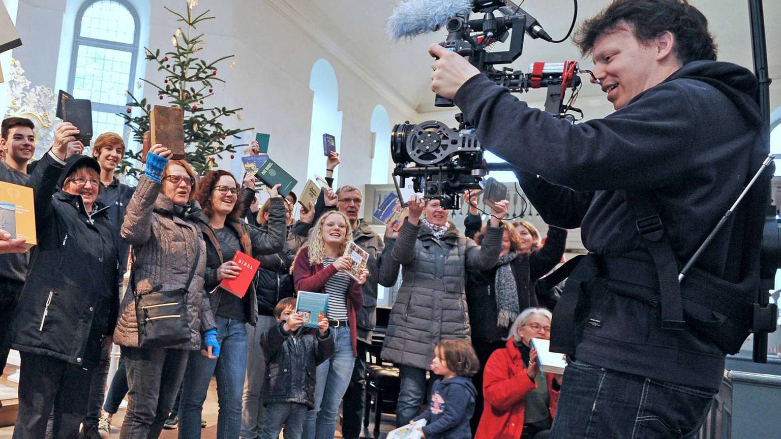 Für den ersten dieser besonderen Gottesdienste in 2019, der am 13. Januar ab 11 Uhr mit Band, Moderation, Kinderbetreuung und Kirchenkaffee geplant ist, haben sich die Kreativen etwas Neues ausgedacht. Am Sonnabend wurden freiwillige Helfer zu Filmaufnahmen vor die Christuskirche gebeten. „Wir wollen das Motto ‚Die Botschaft weitergeben‘ visuell in Szene setzen“, so Rucks, während er verschiedene Bibeln aus dem Kirchenarchiv auspackte.