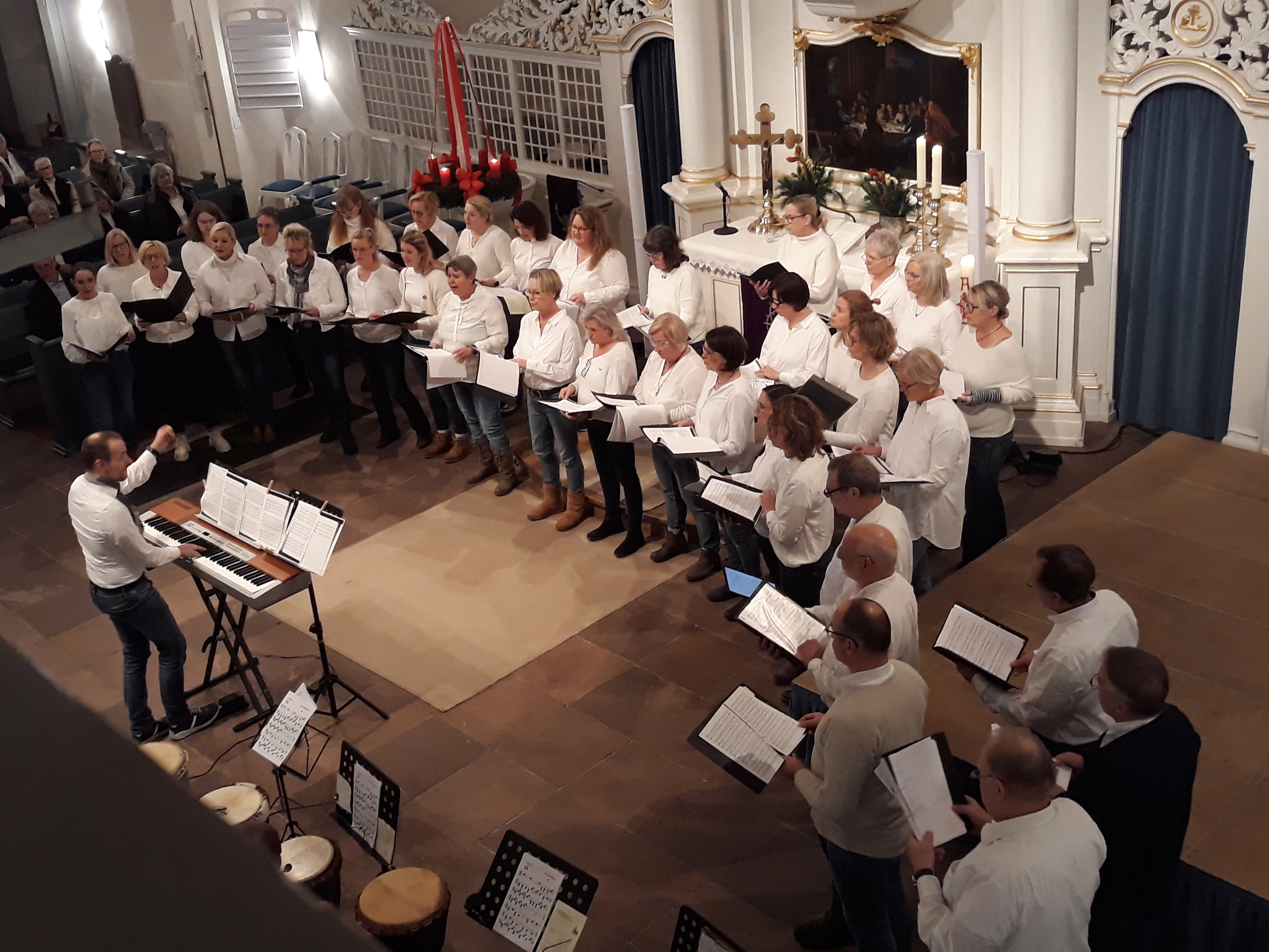 Der Kirchenchor um Leiterin Daniela Predescu gab drei Stücke zum Besten: „Das erste Licht“, „Wieder naht der heil`ge Stern“ sowie „Gloria aus der Tschechischen Weihnachtsmesse“. Anschließend stimmte die Gemeinde „Tochter Zion“ an. Tosenden Applaus erhielt der Gospelchor unter Leitung von Daniela Predescu für seine Darbietungen „Hark! The Herald Angels Sing“, „Oh Little Town of Bethlehem“ und das schwungvolle „Jesus, O What a Wonderful Child“.