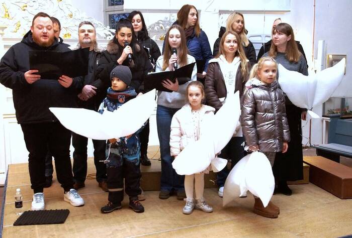 Mit aufblasbaren weißen Friedenstauben in den Händen sangen die Geflüchteten zu Klavier- und Gitarrenbegleitung neben ukrainischen Weihnachtsliedern auch Leonard Cohens Hymne „Hallelujah“ in ihrer Muttersprache – so eindringlich, dass die etwa 90 Zuhörenden den unsäglichen Schmerz fast zu hören glaubten, den der Krieg noch immer Tag für Tag verursacht. Krasnikov-Radloff erwähnte psychologische Hilfe für ukrainische Kinder genauso wie Sachspenden, Unterstützung bei Behördengängen und private Bemühungen, den Geflüchteten hierzulande ein Gefühl von Heimat zu geben.