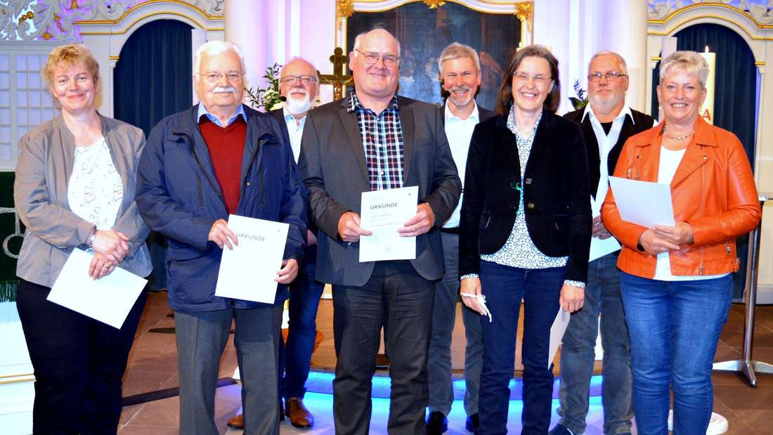 Sodann wandte sich Bösemann direkt an die sechs ausscheidenden Kirchenvorsteher: Ralf Corßen („der Logistiker, der für alles immer einen Plan im Kopf hatte“), Liane Deepe („die Stimme, die oft sagte: ,Moment mal! Lasst uns das noch einmal von einer anderen Seite aus betrachten’“), Reimut Böttcher („der in seiner Genauigkeit jeden Centbetrag und jede Kostenstelle in Sitzungen sofort parat hatte“), Marina Corßen („der wir uns immer besonders gern anvertraut haben, wenn wir sozial unterwegs waren, beispielsweise auf einer Radtour“), Ines Ahlers („bei der man Angst haben musste, dass sie sich beim Hören eines guten Witzes totlacht“), und Heiner Kieselhorst („der uns immer daran erinnert hat, dass wir den Blick für das, was unsere Gemeindeglieder denken und erwarten, nicht verlieren“).
