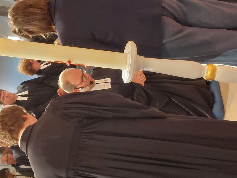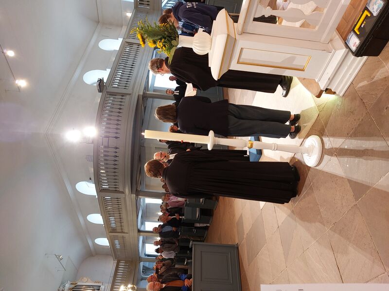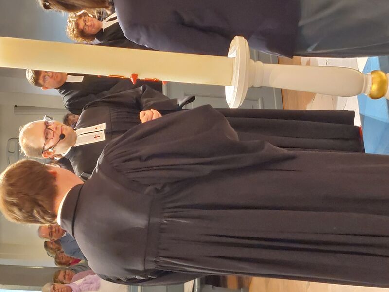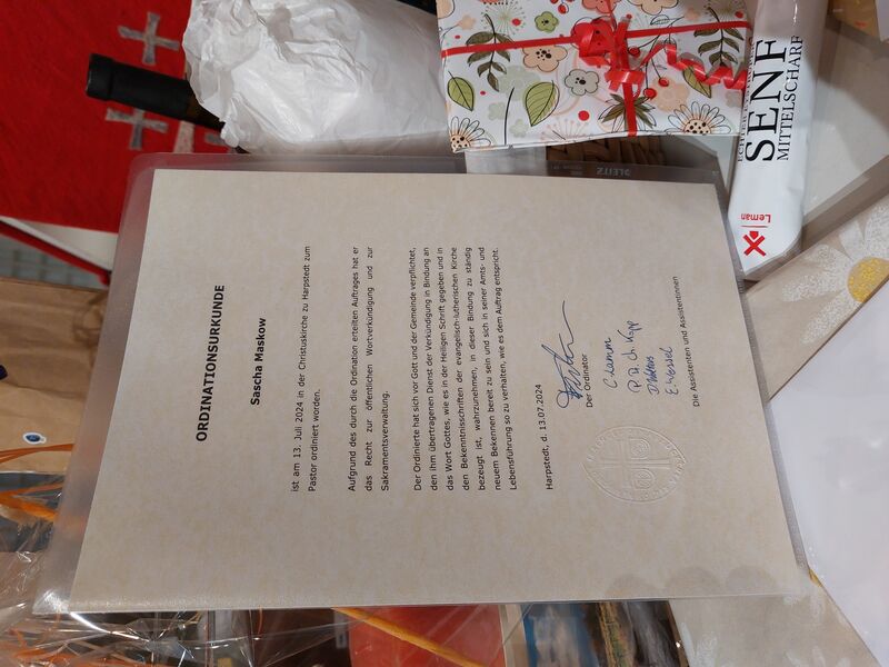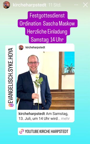 Im Festgottesdienst in der Harpstedter Christuskirche, musikalisch bereichert von Kirchenband, Sängerinnen und Organistin Ilka Major, begleiteten den zu ordinierenden Geistlichen während der Amtshandlung vier Assistenten. Dazu zählte Pastor Christian Kopp aus Syke. Er war in den vergangenen zwei Jahren Maskows Mentor. Daraus entwickelte sich eine tiefe Freundschaft. Ferner wirkten Catharina Lamm, eine Studienkollegin und enge Freundin Maskows, sowie Dominik Wolters aus Syke-Wachendorf mit. Letzterer hatte dem bisherigen Vikar den Start in der Region Syke erleichtert. Last but not least gehörte Emil Wessel aus dem künftigen neuen Wirkungskreis des frischgebackenen Pastors während der Ordinationsfeier zu den Begleitern.