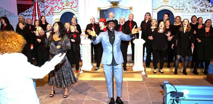 Von „Kumbaya“ bis „Go Tell It On The Mountain“ sang sich die etwa 35-köpfige Gruppe um ihren temperamentvollen Frontmann Edwin Silas kreuz und quer durch die Welt des Gospels. Dass die Instrumentalmusik aus der Konserve kam, tat der Stimmung keinen Abbruch.