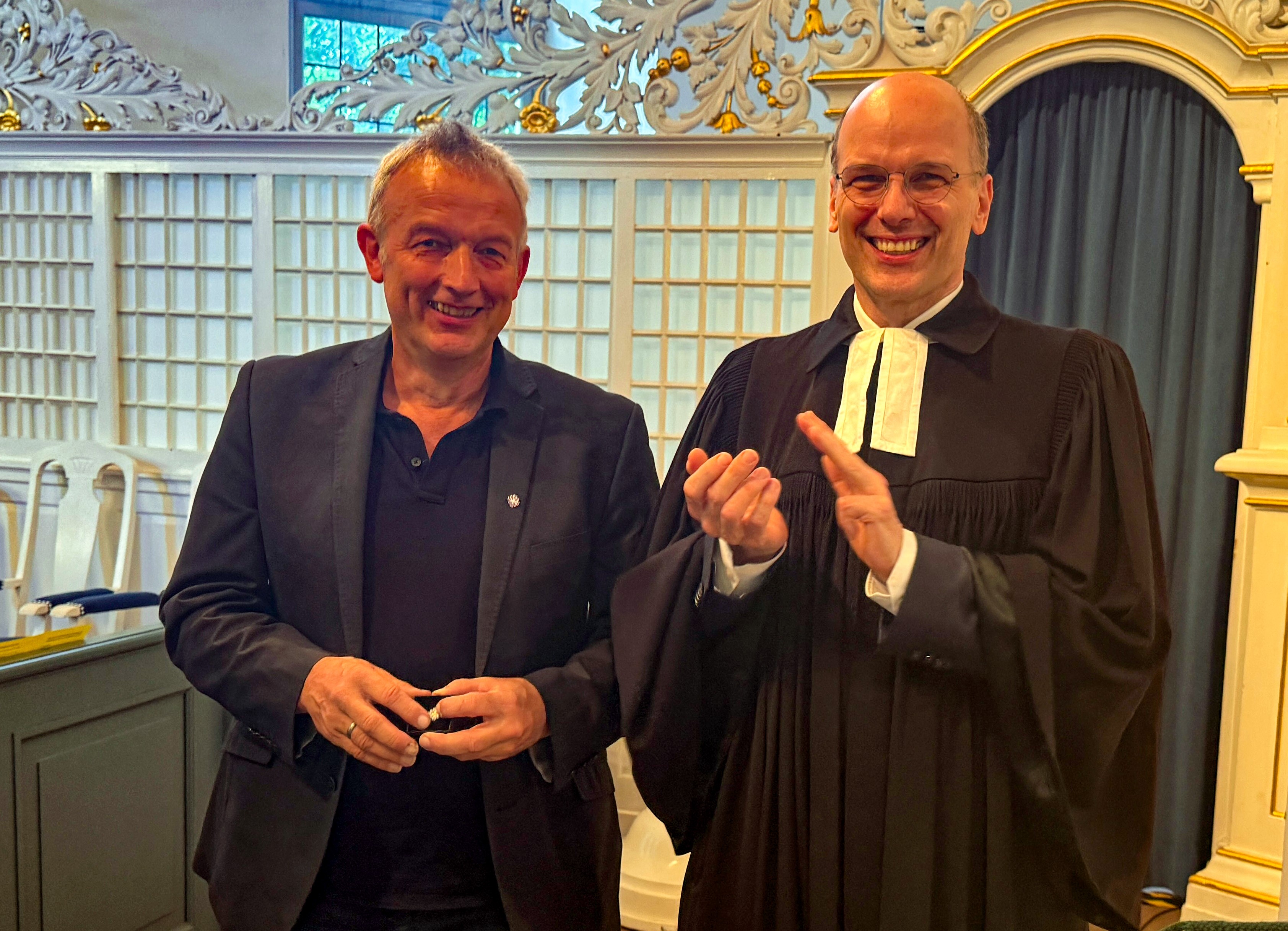 Als Dr. Schröder dann Corleis von seinem Stuhl und aus den Reihen der Musiker zu sich herbat, zauderte dieser ein Stück. Das nützte ihm aber nichts: Bei stehenden Ovationen nahm er die hohe Auszeichnung für ehrenamtliche Kirchenmitglieder schließlich entgegen.