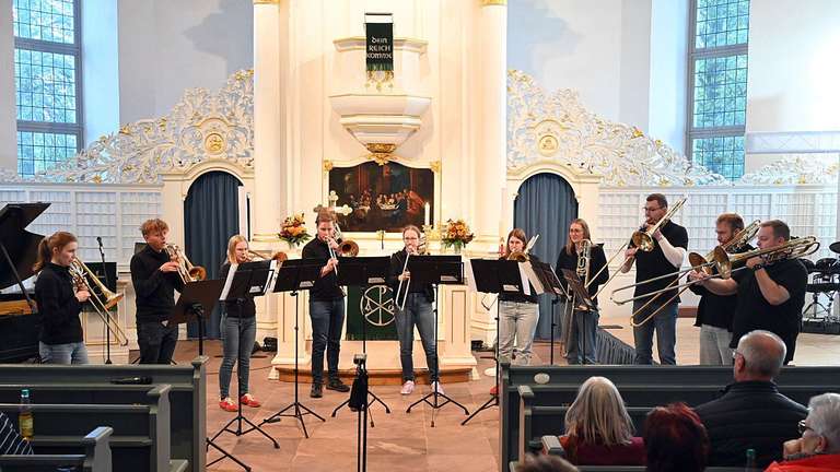 Mit Volldampf rauschte am späten Sonntagnachmittag der „nACHTzug“ aus Hannover durch Harpstedt. Gemeint ist damit weder ein Zug der Deutschen Bahn noch der Nordwestbahn. Auch hat „Jan Harpstedt“ keinen Zuwachs bekommen. „nACHTzug“ ist ein Wortspiel und verweist „sowohl auf die Besetzung mit acht Posaunen als auch auf den charakteristischen Zug unseres Instruments. Das zusätzliche „n“ verwandelt dies in den Begriff „Nachtzug“, der zugleich unsere gemeinsame, musikalische Reise symbolisiert.“ So steht es auf der Homepage des Posaunen-Ensembles, bestehend aus Absolventen und Studenten der Musikhochschule Hannover. Unter dem Titel „BaJazz, BaPop, BaROCK!“ begaben sich die Zuhörer und Musiker auf Spurensuche. Was verbindet Barock und spätere Kulturepochen in der Musik?