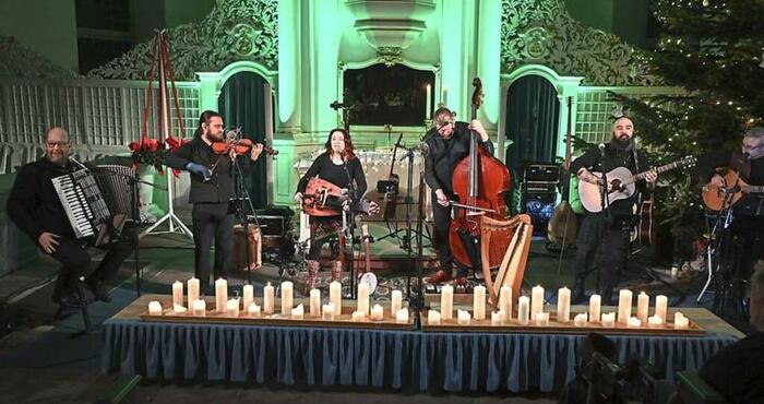 Seit mehr als 25 Jahren tourt die Gruppe von November bis Februar mit gut 30 Konzerten vor allem durch Norddeutschland. Mit ihren herzerwärmenden Klängen eroberten die Vollblutmusiker auch in Harpstedt viele Zuhörer. Bereits der Auftakt sorgte für einen Gänsehautmoment. Vor dem Altar war eine lange Reihe Kerzen aufgebaut, die den Raum erhellten. Im Bühnenbereich standen nur Keno Brandt mit seinem Kontrabass sowie Fernando Olivas mit seiner Gitarre. Sie gaben den Rhythmus vor, worauf die anderen Musiker vom Hauptportal aus in Richtung Bühne schritten. Albertus Akkermann spielte auf dem Akkordeon die Melodie von „Es ist ein Ros´ entsprungen“ an. Die Musik lebt von dem dominanten Bass Brandts und – im Kontrast dazu – der hellen, klaren Stimme von Carmen Bangert, die „nebenbei“ auch noch Drehleier, Whistles, Banjolele sowie Bombo Legüero spielt. Insgesamt ergibt es einen wohligen, vollen Klang – oder wie es Brandt in seiner Ansage formulierte: „Lüchterkark ist eine winterliche, weihnachtliche, wundervolle Welt.“