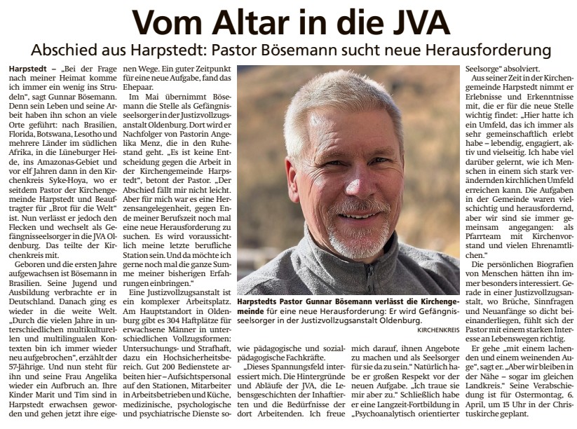 Im Mai übernimmt Gunnar Bösemann die Stelle als Gefängnisseelsorger in der Justizvollzugsanstalt Oldenburg. Dort wird er Nachfolger von Pastorin Angelika Menz, die in den Ruhestand geht. „Es ist keine Entscheidung gegen die Arbeit in der Kirchengemeinde Harpstedt oder den Ort oder die Menschen hier. Das ist mir ganz wichtig“, betont der Pastor. „Der Abschied fällt mir nicht leicht. Aber für mich war es einfach eine Herzensangelegenheit, gegen Ende meiner Berufszeit noch mal eine neue Herausforderung zu suchen. Es wird ja voraussichtlich meine letzte berufliche Station sein. Und da möchte ich gerne noch mal die ganze Summe meiner bisherigen Erfahrungen einbringen.“